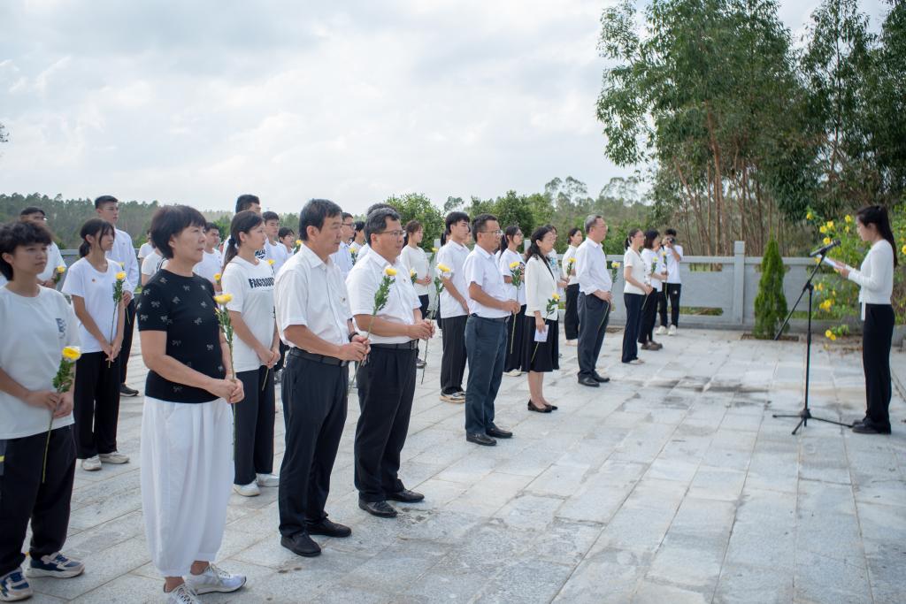 由校党委领导,党委组织部、关工委、离退休人员工作部、校团委及学生代表组成的祭扫队伍手捧鲜花,肃立于碑前,奏唱国歌,举行默哀、献花圈仪式。讲解员深情讲述了烈士们的生平事迹和革命斗争的艰辛历程。通过聆听讲解,师生们深刻感受到了革命先烈英勇奋斗的伟大精神。他们瞻仰烈士,排队献花,轻轻擦拭着英雄的墓碑,表达崇高的敬意。