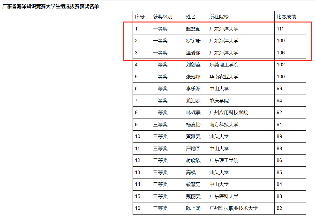 3月31日,由广东省自然资源厅、广东省海防委员会办公室、共青团广东省委员会和自然资源部南海局联合主办的广东省海洋知识竞赛大学生组选拔赛圆满结束。我校赵慧茹、罗宇珊和温爱丽三名同学包揽此次省赛一等奖的3个名额,并获推荐全国总决赛。