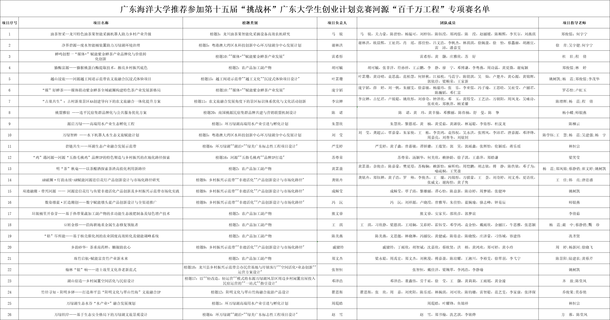 根据《关于组织开展第十五届“挑战杯”广东大学生创业计划竞赛河源“百千万工程”专项赛的通知》相关要求,经团队自主申报、校级书面评审,我校推荐《油茶智采--龙川特色油茶果智能采摘机器人助力乡村产业升级》等26件作品参加该赛事(名单见下)。现对拟推荐名单予以公示,公示期自2026年4月8日至4月12日。