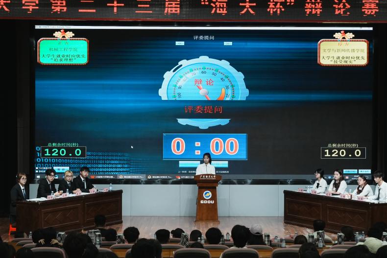 5月25日晚,学校第二十三届“海大杯”辩论赛总决赛在湖光校区广学楼多功能厅举行。总决赛对阵双方为机械工程学院辩论队(正方)与文学与新闻传播学院辩论队(反方)。评审团、大众评委、仲裁公证人、学生代表等现场观赛。